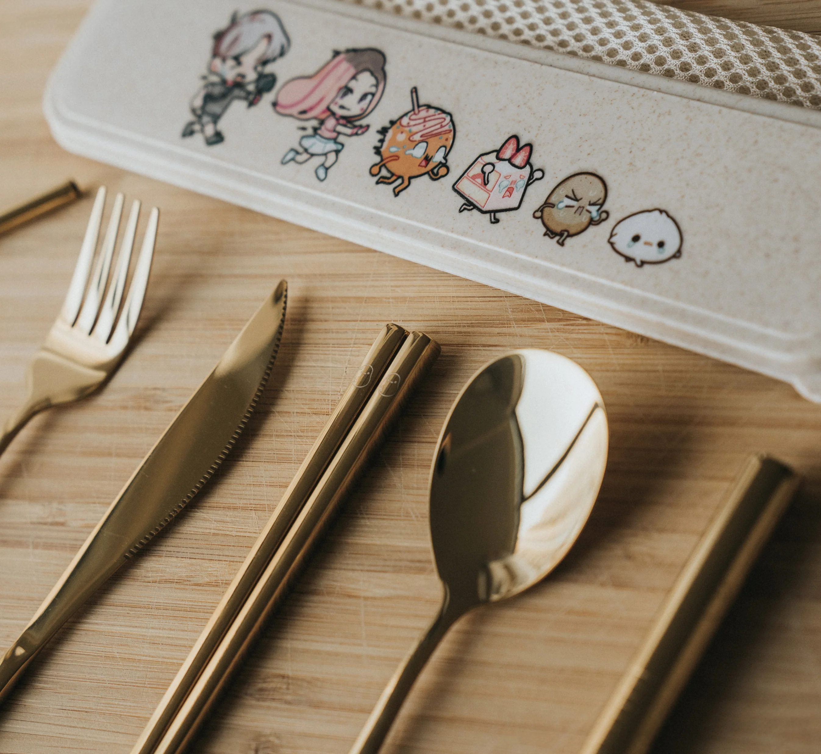 A 7-piece cutlery set with gold or rose gold cutlery, beige box and larger utensils!