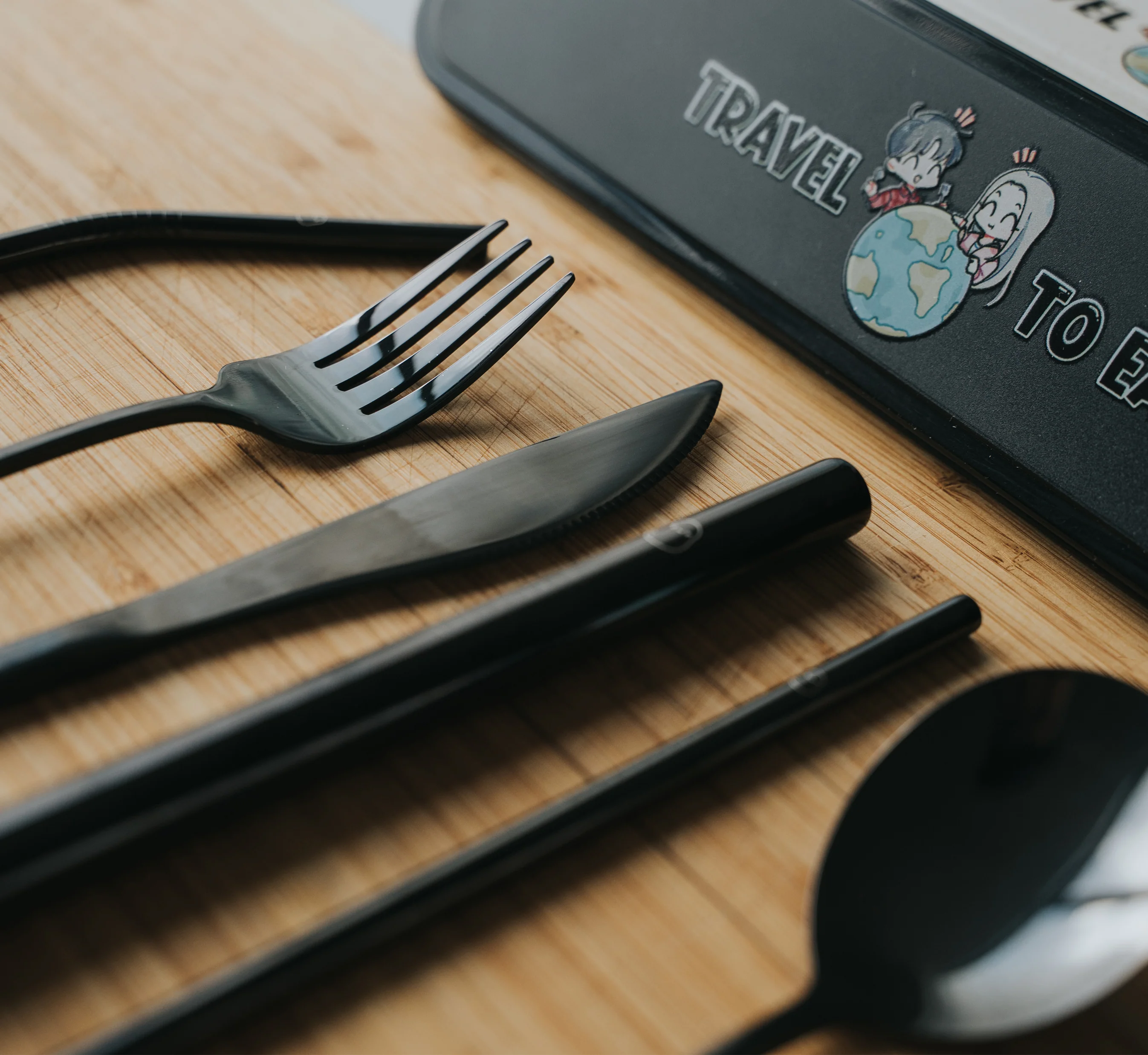A 7-piece cutlery set with black cutlery, black box and larger utensils!